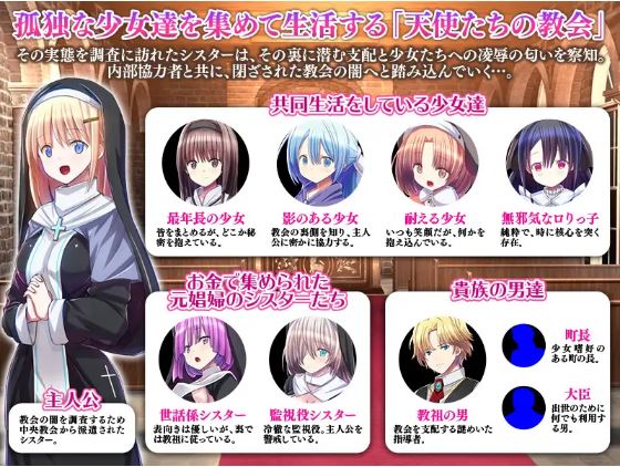 天使教会,调查一群孤独少女聚集居住的真实情况。她嗅到了教会背后潜藏的控制和对少女的凌辱的气息。 她与一位内部同伙一起,深入探索这座封闭教会的黑暗面…… ■天使教会主要角色■ -主角- □中央教会派遣的修女……被派去调查教会黑暗面的女性。 -共同生活的女孩们- □年纪最大的女孩……她将大家凝聚在一起,但却隐藏着一个秘密。 □内心阴暗的女孩……她了解了教会的黑暗面,并与主角秘密合作。 □ 耐心的女孩……总是面带微笑,但内心深处却隐藏着什么。 □天真无邪的女孩……她纯洁的存在有时能直击问题的核心。 -修女们都是被金钱聚集在一起的前妓女- □表面上是一位温柔的守护者修女。实际上,她服从于教主 。 □冷酷无情的姐姐, 对主角充满戒心。——贵族男士们 ——□邪教领袖……掌控教会的神秘领袖。 □市长:一个对年轻女孩有特殊癖好的镇长。 □大臣:一个为了上位不择手段的人。